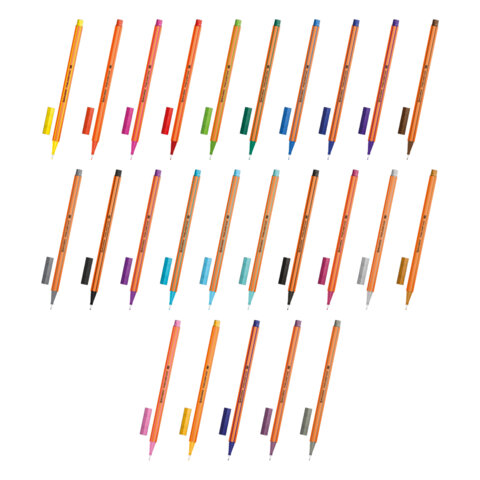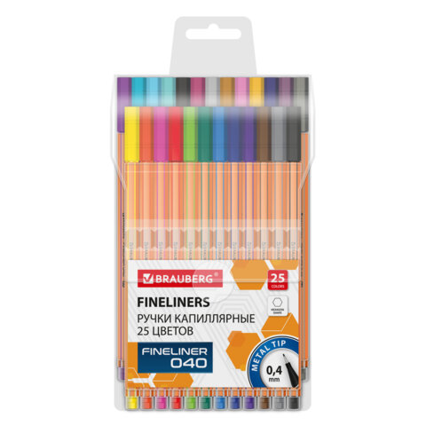 Набор капиллярных ручек BRAUBERG "FINE 040" состоит из 25 ярких цветов: желтый, оранжевый, розовый, красный, светло-зеленый, зеленый, голубой, синий, фиолетовый, коричневый, серый, черный, сиреневый, морская волна, небесно-голубой, мятный, черное дерево, винный, светло-серый, светло-коричневый, светло-розовый, тёмно-синий, пурпурный, темно-серый.