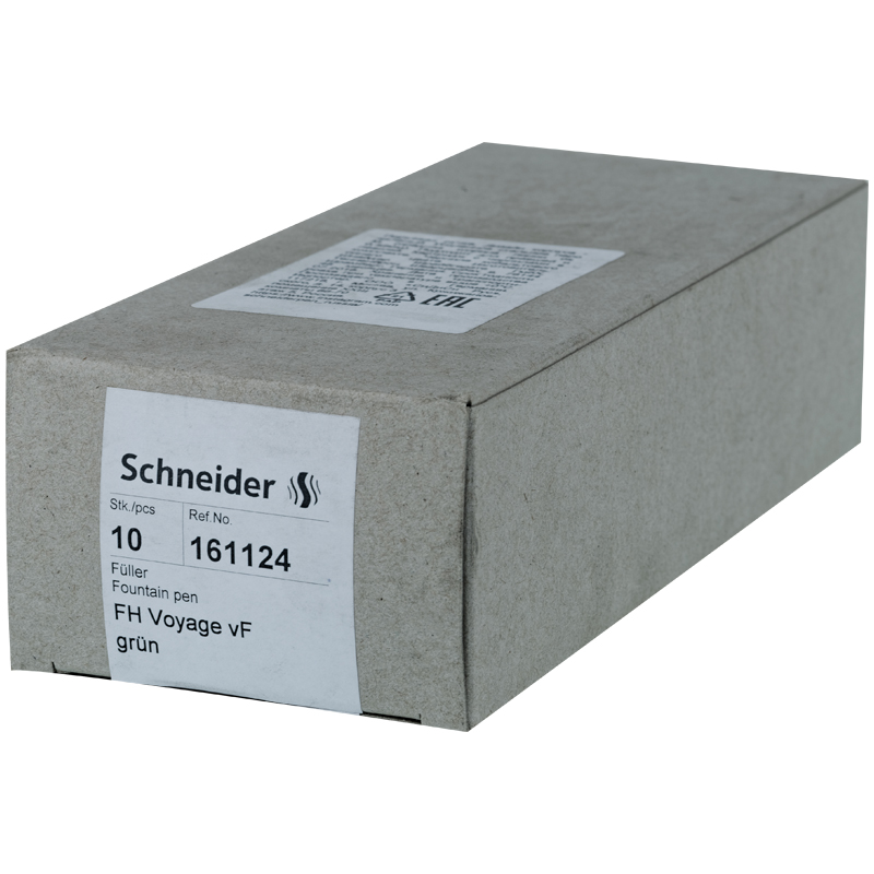 Перьевая ручка Schneider Voyage в стильном дизайне. Круглый корпус с зеленым резиновым грипом и усиленным стальным пером. В комплекте 1 стандартный картридж с чернилами синего цвета. Чернила ручки быстросохнущие, поэтому ручка подходит для письма и правой, и левой рукой. Толщина линии письма – М(средняя). Письменные принадлежности Schneider разрабатываются и производятся только в Германии,их отличают безупречное качество, надежность и экологичность. <br/>• Цвет чернил: синий;<br/>• Толщина линии письма: 0.42 мм;<br/>• Особенность чернил: быстросохнущие;<br/>• Цвет корпуса: зеленый;<br/>• Прорезиненный грип: есть;<br/>• Страна производства: Германия