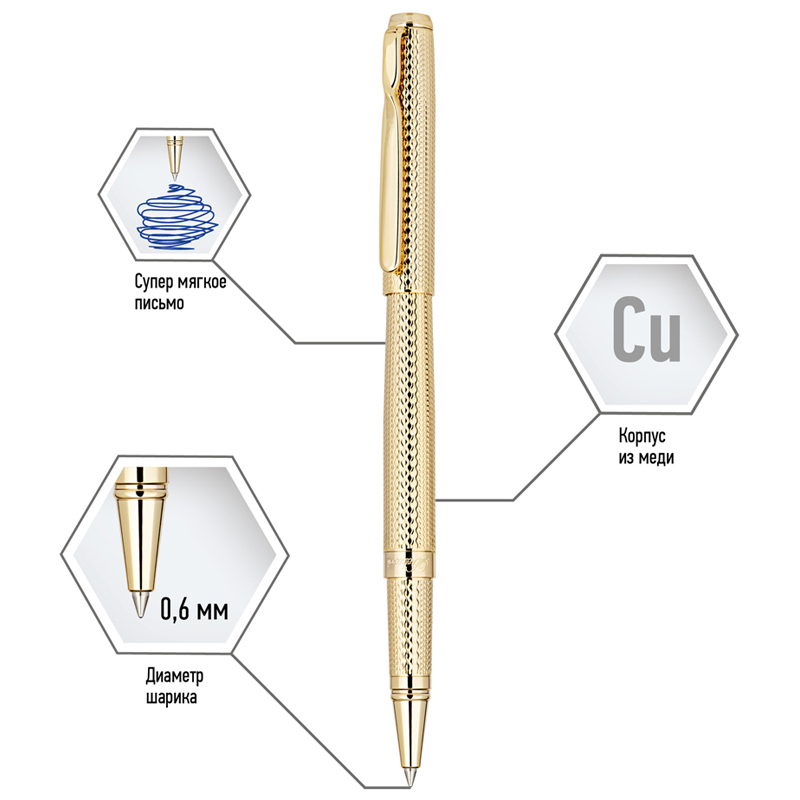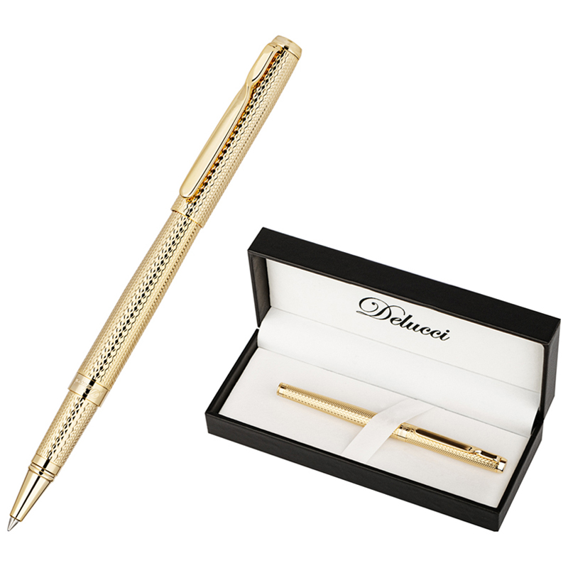 Изящная подарочная ручка-роллер Delucci Celeste подчеркнёт статус обладателя. Золотистый цвет и интересное рифление привлекут внимание, а медный корпус с никелированием гарантирует прочность. Закрученный клип из нержавеющей стали выполняет не только практическую функцию — закрепить изделие на ежедневнике или кармане, но и добавляет оригинальности. <br/>Кроме того, ручкой очень легко писать. Синие чернила такой ручки хорошо впитываются, она оставляет похожий на перьевой след. Благодаря этому для письма требуется меньше давления, поэтому рука не так сильно напрягается. Легкому и быстрому письму также способствует оптимальный диаметр пишущего узла – 0,6 мм и толщина линии 0,5 мм. <br/>Delucci Celeste — это подходящий презент даже для серьёзного руководителя.<br/>Изделие упаковано в кожаный футляр с откидной крышкой. <br/>• цвет чернил: синий;<br/>• толщина линии письма: 0,5 мм;<br/>• диаметр пишущего узла: 0,6 мм;<br/>• цвет корпуса: золото;<br/>• тип упаковки: футляр с откидной крышкой;<br/>• комплектация: футляр, ручка.