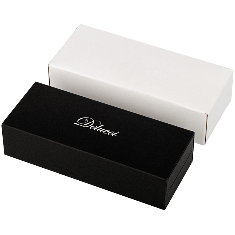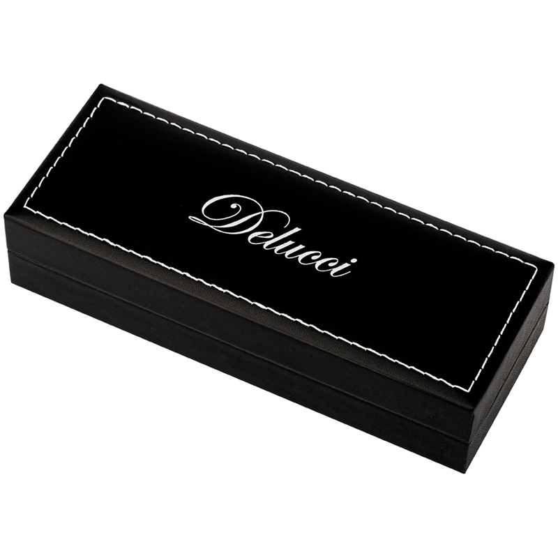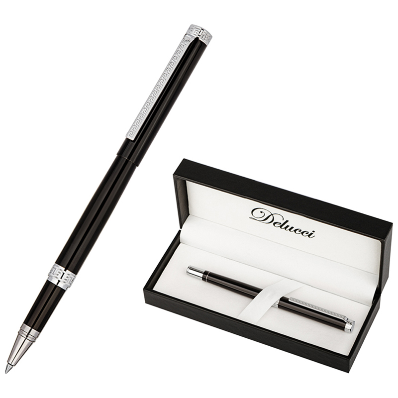 Подарочная ручка-роллер Delucci серии Classico – это элегантное сочетание чёрного корпуса с серебряными деталями. Медь и никелированное покрытие делают её качественной, а вычурности добавляет гравировка на клипе и торце, которая напоминает египетские мотивы. Поэтому ручка с черными чернилами отлично подойдёт ценителям оригинальных вещей. Клип также выполнен из меди. С помощью него пишущеё средство можно закрепить там, где необходимо, и оно всегда будет под рукой. <br/>Диаметр пишущего узла – 0,6 мм, а толщина линии письма – 0,4 мм. Это значит, что ручка будет оставлять аккуратный след и подойдёт для любого стиля письма. <br/>Изделие Упаковано в кожаный футляр с фирменным логотипом. <br/>• цвет чернил: чёрный;<br/>• толщина линии письма: 0,4 мм;<br/>• диаметр пишущего узла: 0,6 мм;<br/>• цвет корпуса: чёрный/хром;<br/>• тип упаковки: кожаный футляр;<br/>• комплектация: футляр, ручка.