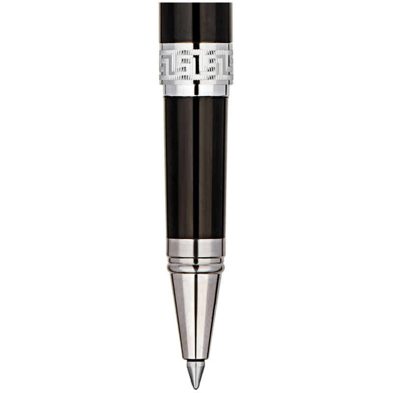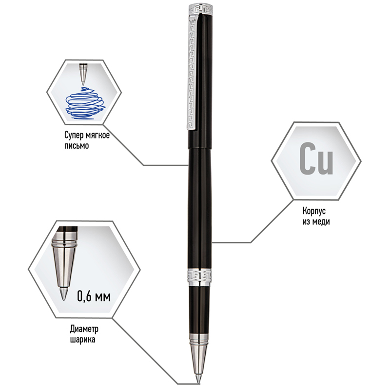 Подарочная ручка-роллер Delucci серии Classico – это элегантное сочетание чёрного корпуса с серебряными деталями. Медь и никелированное покрытие делают её качественной, а вычурности добавляет гравировка на клипе и торце, которая напоминает египетские мотивы. Поэтому ручка с черными чернилами отлично подойдёт ценителям оригинальных вещей. Клип также выполнен из меди. С помощью него пишущеё средство можно закрепить там, где необходимо, и оно всегда будет под рукой.