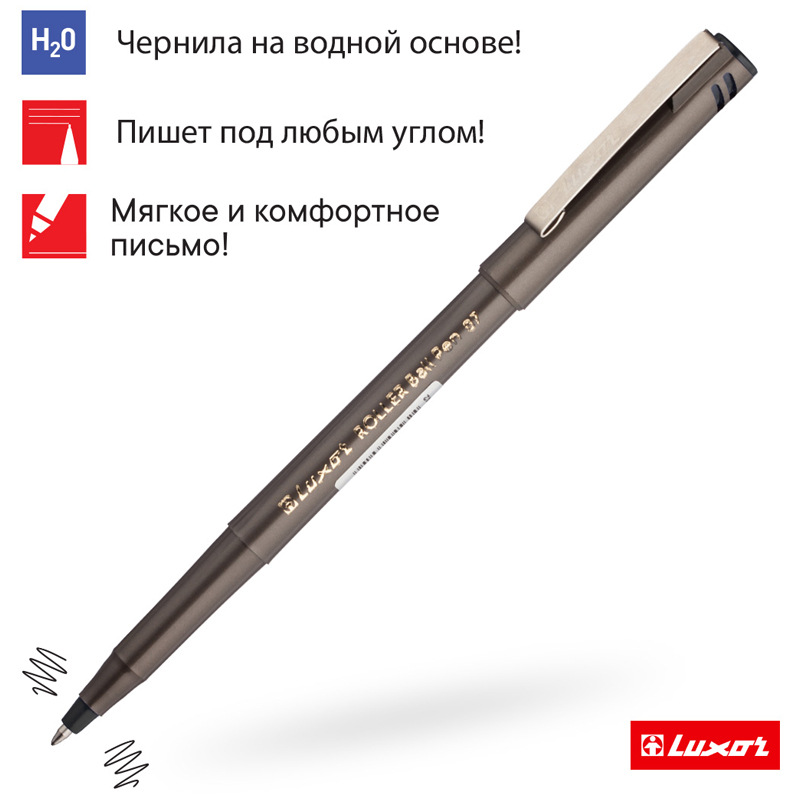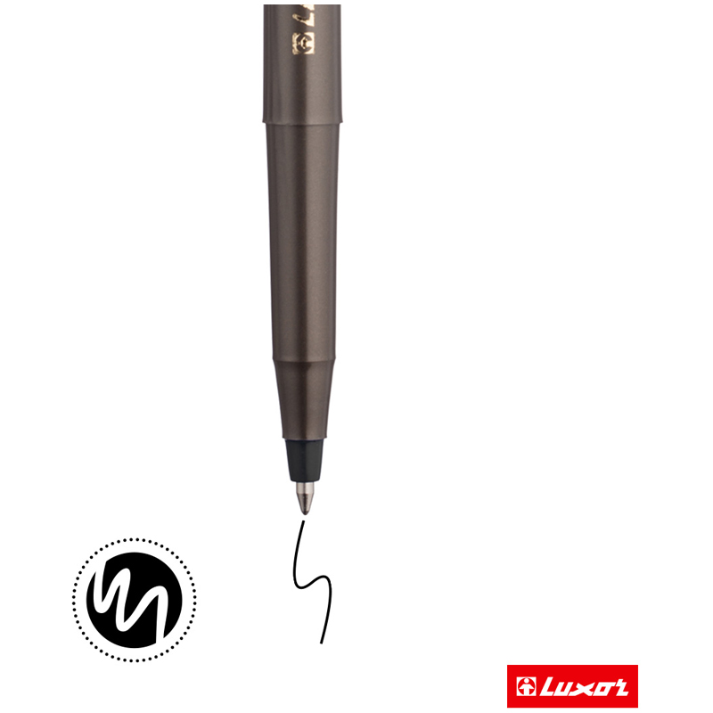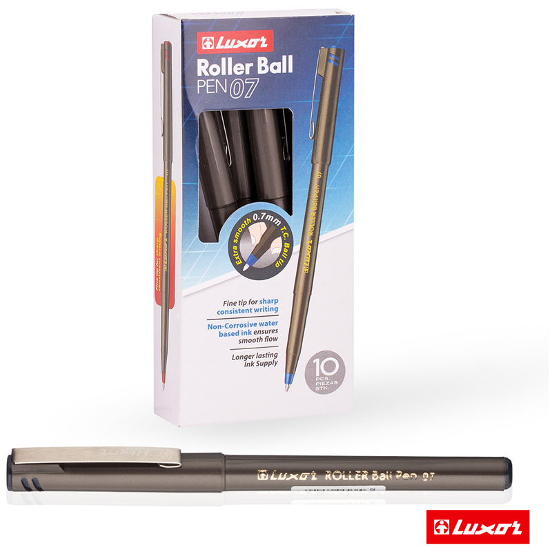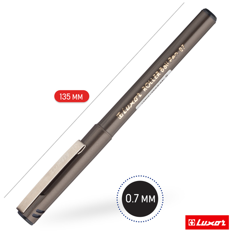 Ручка-роллер Luxor - шариковая ручка с уникальными чернилами на водной основе пониженной вязкости. Диаметр пишущего узла - 0,7 мм, что говорит о том, что изделие подходит для любого типа письма. Толщина линии письма составляет 0,5 мм. Набор из 10 ручек упакован в картонную коробку. Черная ручка-роллер подходит для учебы, работы, для ведения документооборота, заметок в ежедневнике, заполнения личного дневника, рисунков в скетчбуке. Светостойкие чернила на водной основе не выцветают под воздействием солнечных лучей и легко отстирываются с одежды. Благодаря особому строению пишущего узла ручка пишет мягко под любым углом и не царапает бумагу. Чернила мгновенно высыхают на бумаге, поэтому надписи и рисунки не размазываются. Изделие имеет колпачок с металлическим клипом, который позволит прикрепить ручку-роллер к ежедневнику или блокноту и всегда носить её с собой.