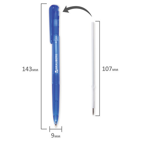 Имеет круглый корпус из тонированного пластика насыщенного синего цвета. Сменный стержень длиной 107 мм со стандартным наконечником позволит использовать ручку максимально долго. Диаметр пишущего узла, равный 0,7 мм, создает тонкую линию письма, равную 0,35 мм. Цвет чернил - синий.