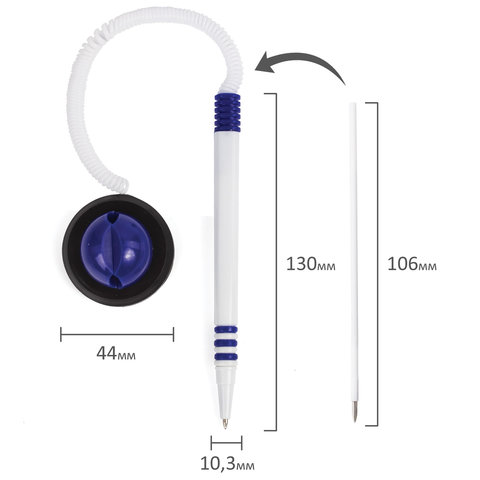 Корпус ручки и подставки выполнен из пластика белого цвета с синими деталями. Ручка крепится к подставке с помощью пружинки и фиксируется на любой ровной поверхности с помощью клейкого основания на подставке. Длина стержня составляет 106 мм. Диаметр основания - 4,4 см. Создает линию письма толщиной 0,5 мм. Цвет чернил - синий.