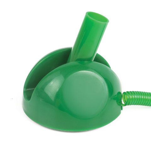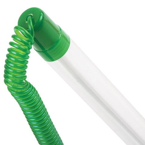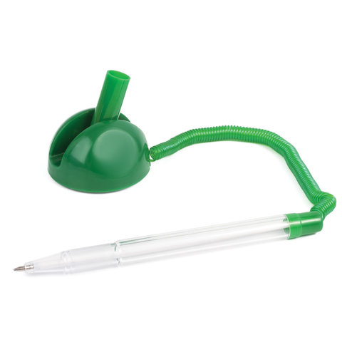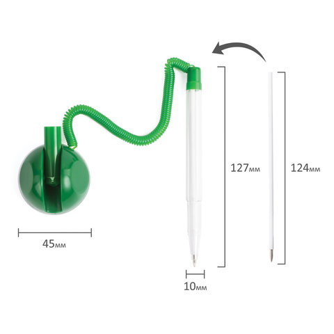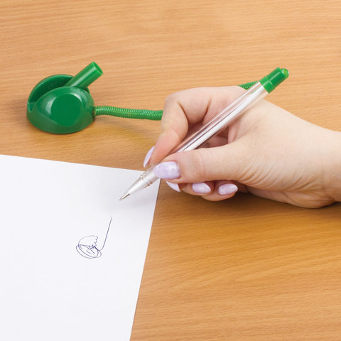 Корпус ручки прозрачный, подставка и детали ручки выполнены из пластика зеленого цвета. Ручка крепится к подставке с помощью пружинки и фиксируется на любой ровной поверхности с помощью клейкого основания и с регулируемым углом наклона. Длина стержня составляет 124 мм. Диаметр основания - 4,5 см. Создает линию письма толщиной 0,5 мм. Цвет чернил - синий.