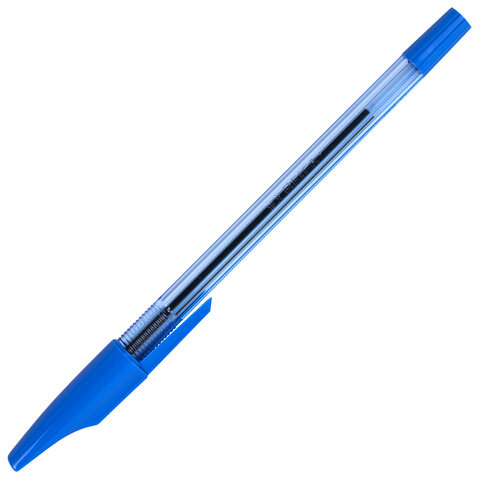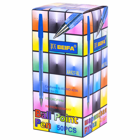 Удобная шариковая ручка BEIFA в круглом корпусе из тонированного синим пластика с деталями в цвет чернил и рифлением в зоне захвата.