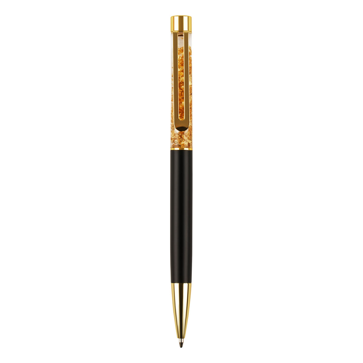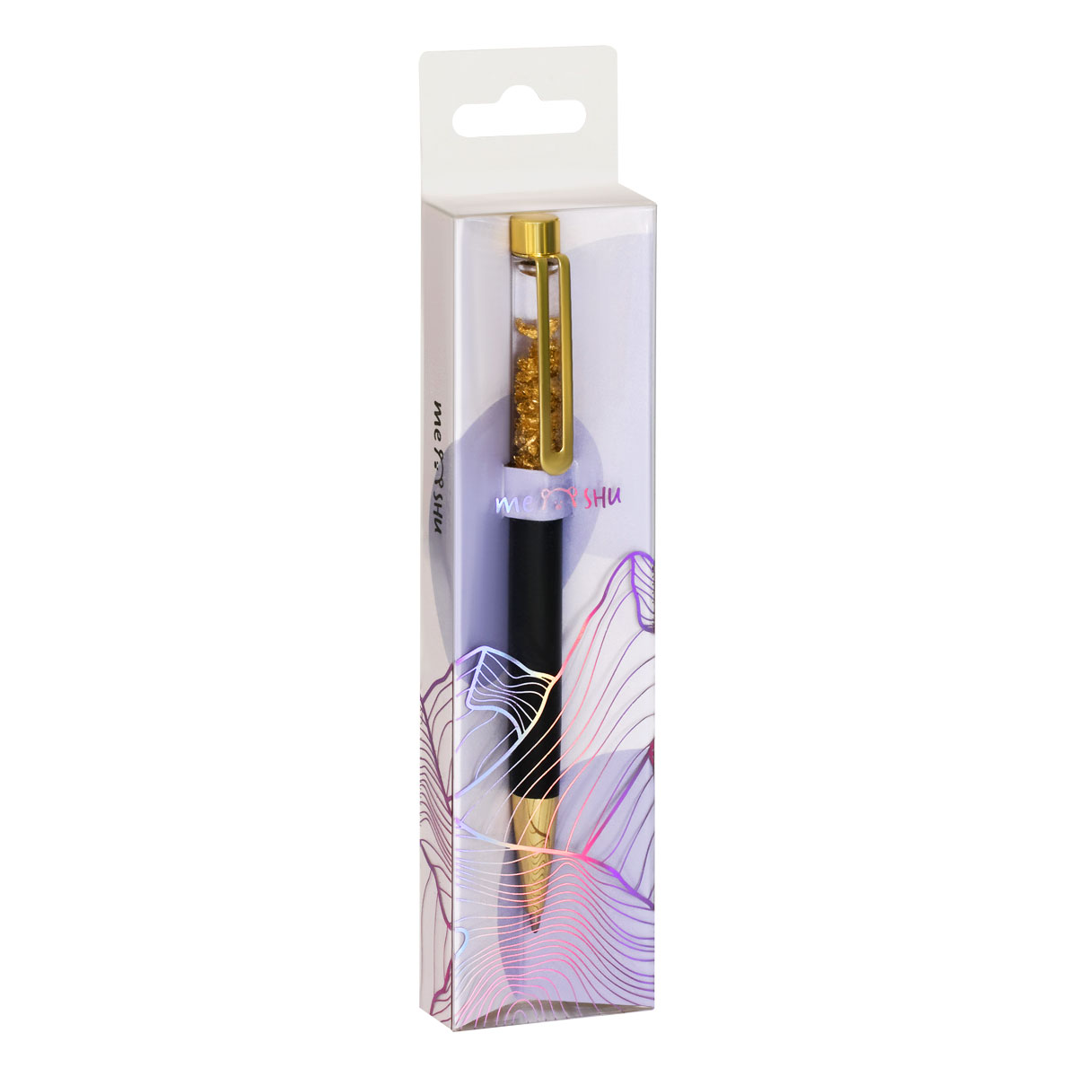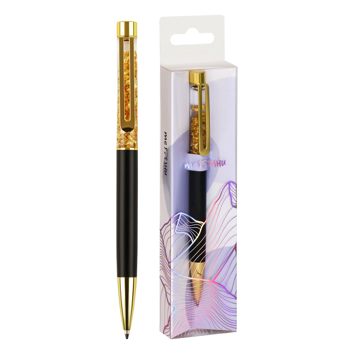 Шариковая ручка MESHU – это привлекательный аксессуар для ярких, смелых и успешных. Диаметр пишущего узла: 1 мм. Ручка подойдёт для мягкого и быстрого письма. Золотой корпус ручки из металла с черным матовым эффектом украшен вставкой с золотой поталью и дополнен металлическим клипом, с помощью которого ручку можно закрепить на одежде или ежедневнике.<br/>Ручка Gold sand обязательно принесёт удачу в заключении важных контрактов и торжественных соглашений. Изящные и плавные линии, декоративные детали станут неотъемлемой частью праздничной и радостной атмосферы. Благодаря упаковке с голографическими элементами, ручка может стать приятным подарком. Ручка оснащена поворотным механизмом, что говорит о надёжности и безопасности изделия, Стержень не повредится в сумке и не оставит следов на посторонних предметах. Благодаря чернилам синего цвета ручку можно использовать в работе или учёбе на постоянной основе. <br/>• Цвет чернил: синий;<br/>• Диаметр пишущего узла: 1 мм;<br/>• Форма корпуса: круглая;<br/>• Длина корпуса: 148 мм.