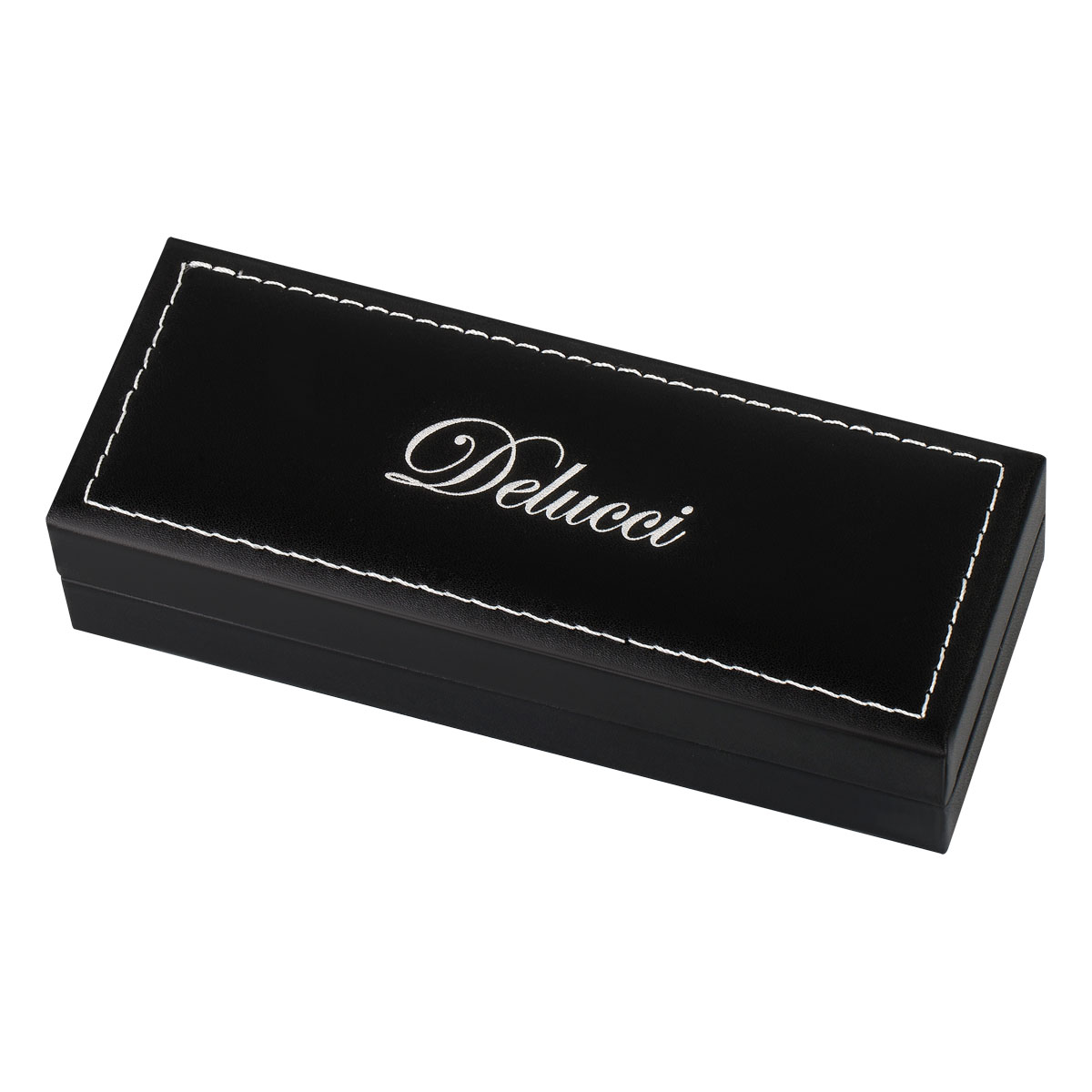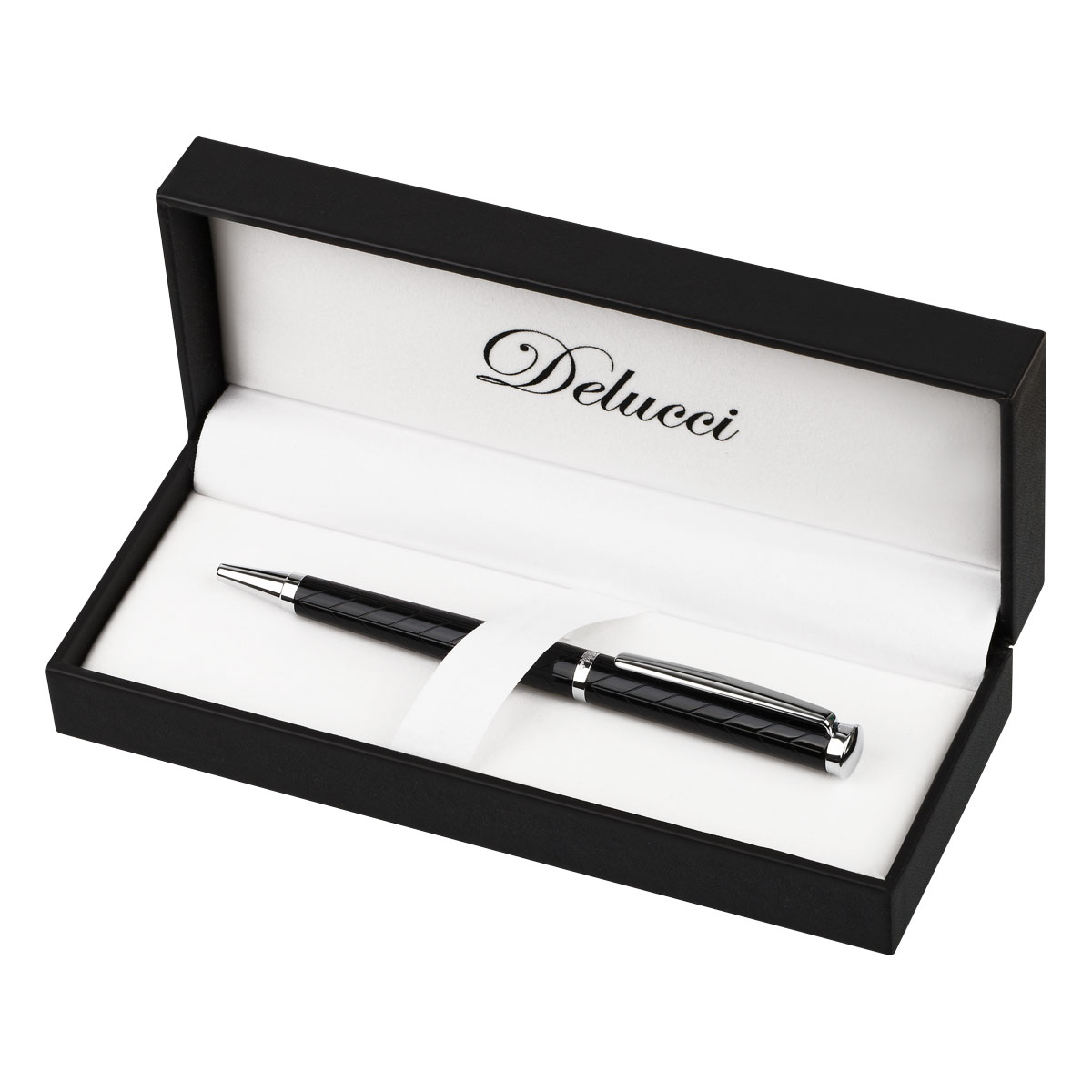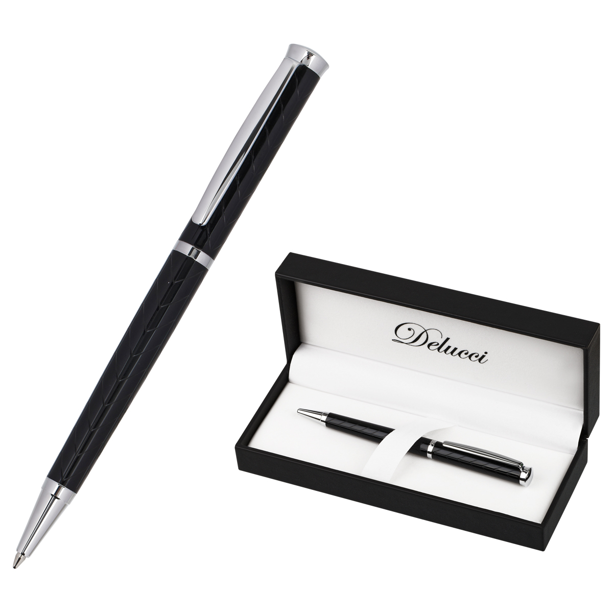 Delucci Impero – это стильная подарочная шариковая ручка с синими чернилами. Классическое сочетание чёрного корпуса и серебрянных элементов оригинально дополняет гравировка из симметрично изогнутых линий по всей длине корпуса. Клип сделан из нержавеющей стали, он позволяет фиксировать ручку на ежедневниках, блокнотах и карманах одежды. Delucci Impero оснащена поворотным механизмом, внутри которого расположен пишущий стержень диаметром 1 мм, который идеально подходит для быстрого стиля письма. Упакована в кожаный футляр.<br/>• Цвет чернил: синий;<br/>• толщина линии письма: 0,7 мм;<br/>• цвет корпуса: чёрный/серебро;<br/>• тип упаковки: кожаный футляр;<br/>• комплектация: футляр, ручка.