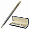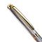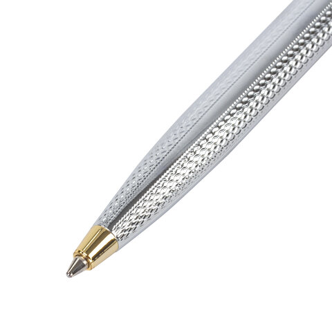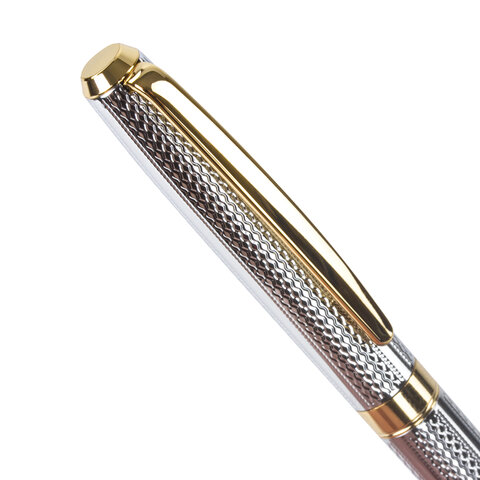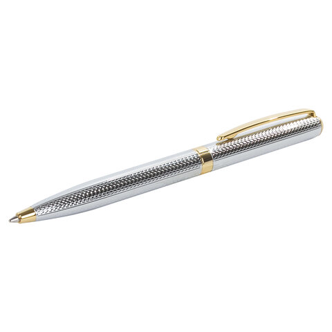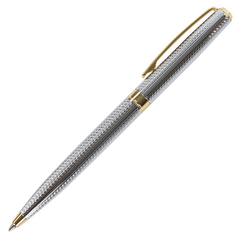 Утонченная модель ручки с корпусом из латуни серебристого цвета и золотыми деталями прекрасно лежит в руке. Синий цвет чернил, длина стержня составляет 98 мм, а диаметр пишущего узла - 0,7 мм. Поставляется в индивидуальном подарочном футляре. Подходит для гравировки.