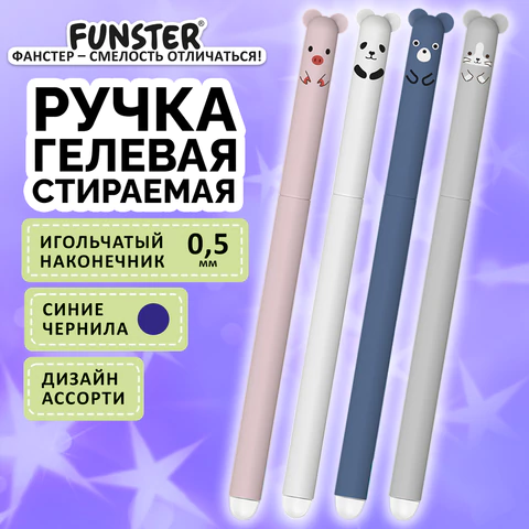 Стираемая ручка FUNSTER - надежный инструмент для ведения аккуратных записей и создания хорошего настроения. Ручка обеспечит заметки без помарок, а очаровательный дизайн с колпачками в виде милых животных подарит позитивные эмоции в процессе письма.