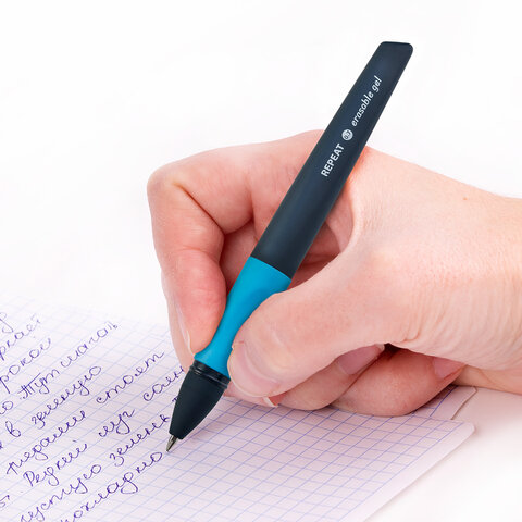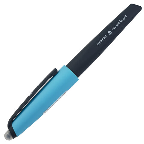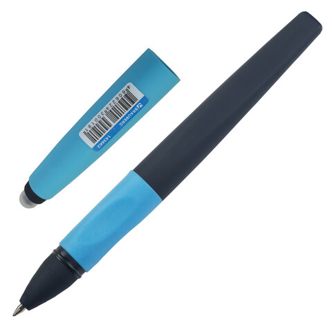Ручка имеет корпус черного цвета с эргономичной зоной захвата для комфортного и длительного использования. Цвет деталей - синий. Ручка пишет специальными гелевыми чернилами синего цвета. Снабжена ластиком для удаления надписей. При письме и стирании ручка не повреждает бумагу, а исправления остаются незаметными. Диаметр пишущего узла 0,7 мм создает тонкую линию письма, равную 0,5 мм.