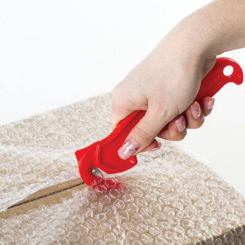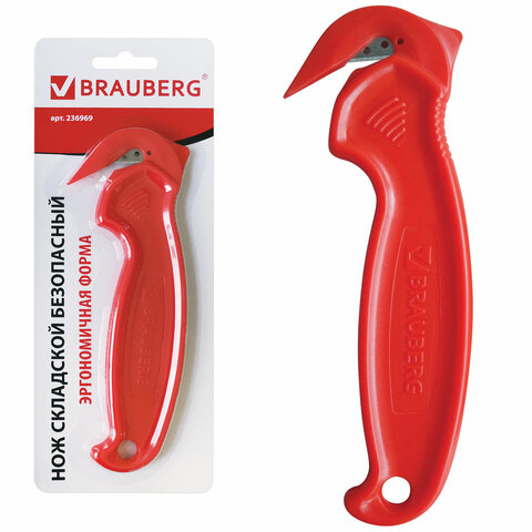 Ручка, изготовленная из плотного красного пластика, надежно держит складывающееся изогнутое лезвие. Механизм фиксации исключает риск травмироваться. Ручка имеет анатомическое строение, удобное для использования правшами и левшами. Отверстие в ручке позволяет подвешивать инструмент в нужном месте. Товар продается в пластиковом блистере.
