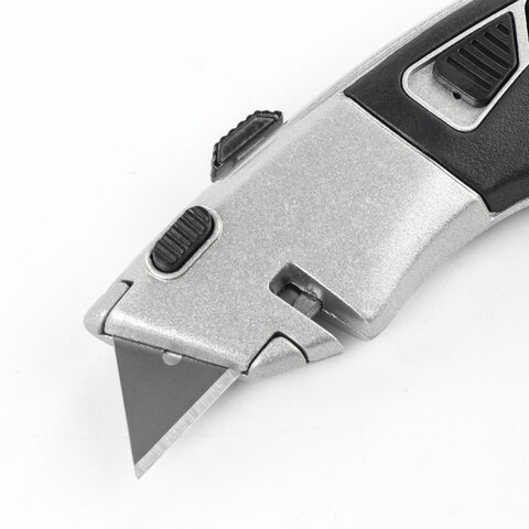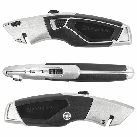 Универсальный мощный нож с фиксатором BRAUBERG - инструмент, который поможет при резке бумаги, пластика, картона и прочих плотных и вязких материалов: линолеума, гипсокартона, ковролина. В корпусе изделия - 3 дополнительных лезвия.