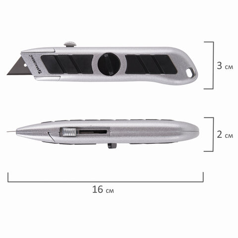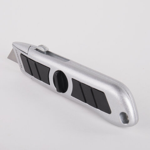 Металлический корпус надежно фиксирует стальное острое лезвие шириной 18 мм. Изделие имеет эргономичное оформление: рукоятка снабжена резиновыми антискользящими вкладышами, серебристо-черный цвет корпуса гармонирует с другими инструментами, специальное отверстие дает возможность вешать нож на специальный крепеж. 5 легко заменяемых дополнительных лезвий в комплекте продлят срок использования ножа. Конструкция упакована в блистер.