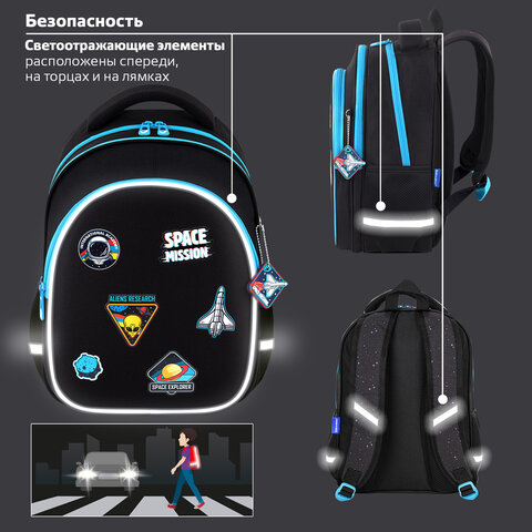 Светоотражающие элементы ранца расположены спереди, на торцах и на лямках. Они необходимы для безопасности пользователя в темное время суток.