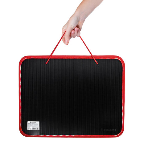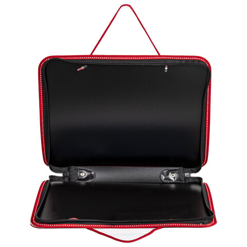 Изготовлена из прочного непрозрачного пластика толщиной 1 мм. Формат папки А4 (350х270х45 мм). Имеет одно отделение. Надежный замок-молния защищает документы от механических повреждений, а также пыли и влаги. Веревочные ручки. Выполнена в основном черном цвете с фактурой под "бисер" с красной окантовкой.