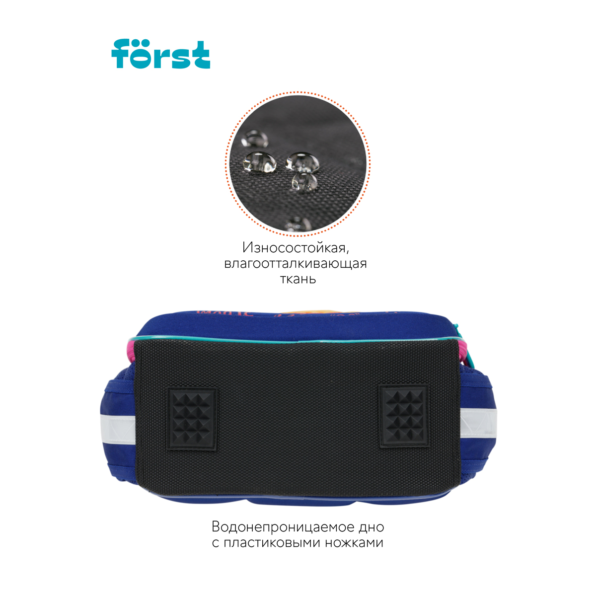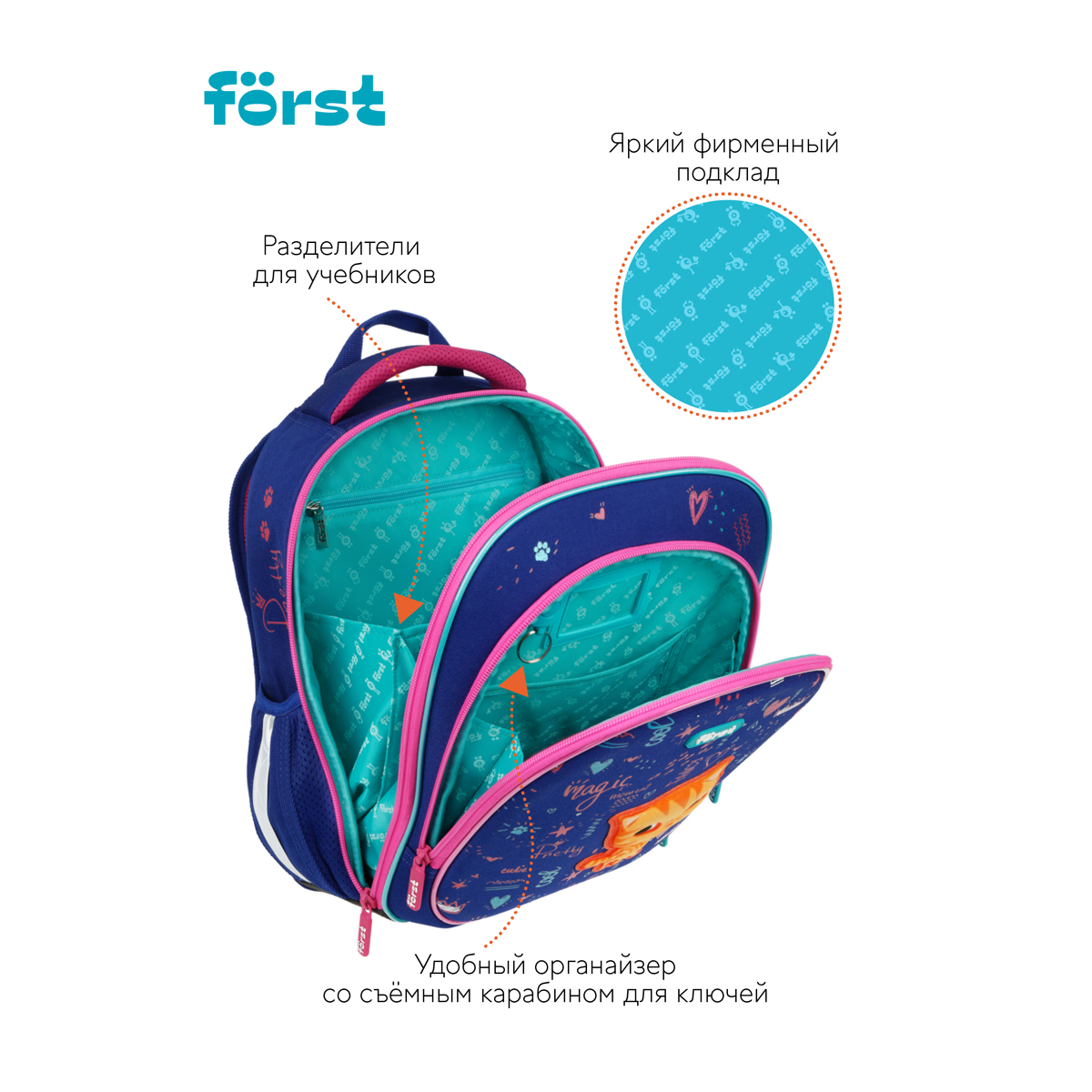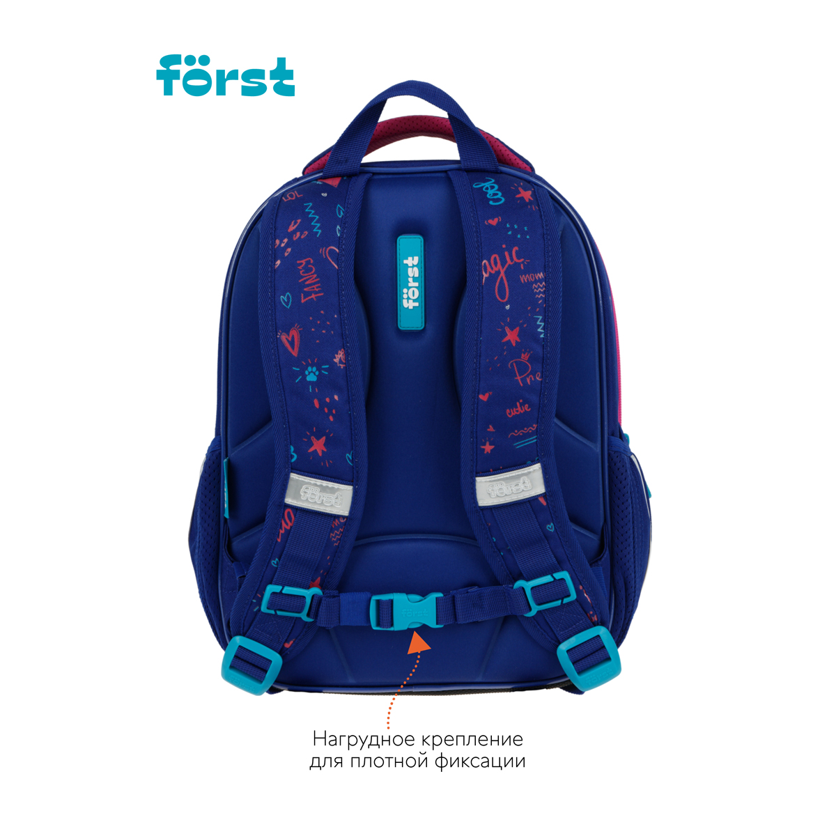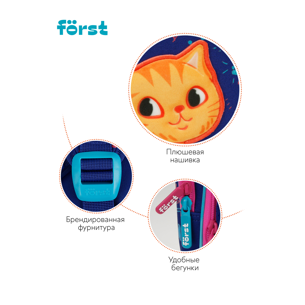Ранец Först F-LIGHT Funny cat размером 37*28*16 см и объемом 17 литров с двумя отделениями и двумя внешними карманами, разделителями для учебников и тетрадей, карманом на молнии, съемным карабином для ключей, именной карточкой. Передняя часть и спинка ранца жесткие, а боковые панели уплотнены слоем спонжа. благодаря анатомической формованной спинке из ЭВА-материала, а также регулируемым по длине лямкам и нагрудному креплению, он плотно фиксируется на спине ребенка. Дно — из водонепроницаемого материала с пластиковыми ножками для защиты от влаги. Ранец с плотной ручкой и петлей для подвешивания. Световозвращающие элементы на передней части, сбоку и на лямках обеспечивают безопасность в темное время суток.<br/><br/>• Размер изделия: 37*28*16 см; <br/>• Вес: 850 г;<br/>• Объём: 17 литров;<br/>• Возрастная группа: для учеников младшей и средней школы.