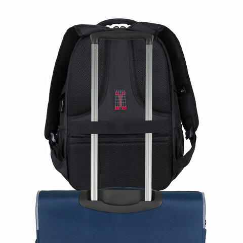 Багажная лента позволяет зафиксировать рюкзак на телескопической ручке чемодана для удобного перемещения нескольких предметов багажа.