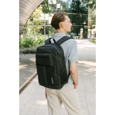 Основное отделение оснащено мягким карманом для ноутбука до 17 дюймов и дополнительными отделениями для организации ваших вещей. Всего имеется 6 карманов: три небольших передних на молнии, два боковых сетчатых кармана для бутылок или зонтов и небольшой потайной карман на спине для ценных предметов и безопасности.