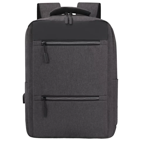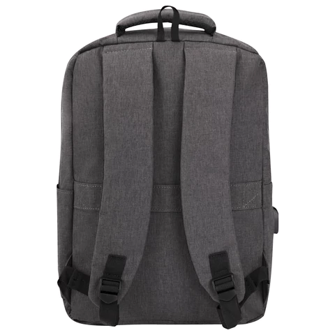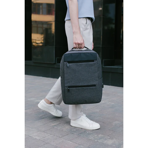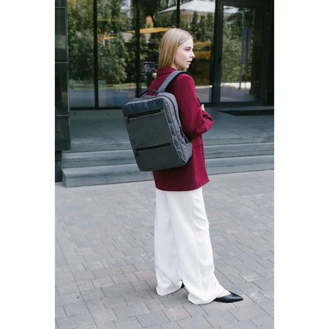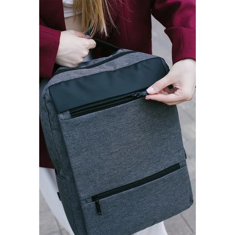 Доступ к основному отделению осуществляется с обеих сторон через надежные двухсторонние молнии с крупными брендированными бегунками, что облегчает быстрый и удобный доступ независимо от положения рюкзака. Внутри — 5 карманов: два передних на молнии, один боковой для бутылки или зонта, а также карман-органайзер и карман для ноутбука. Встроенный USB-порт позволяет заряжать гаджеты на ходу, а багажная лента помогает фиксировать рюкзак на верхней ручке чемодана.