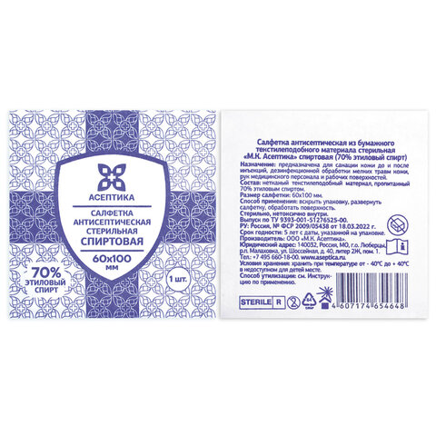 Спиртовая салфетка АСЕПТИКА в саше для санации и дезинфекционной обработки кожи и других поверхностей.