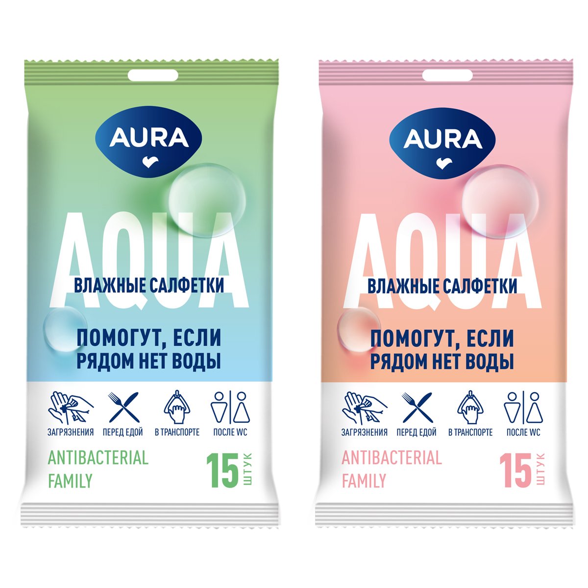 Салфетки влажные Aura "Family", 15шт., антибактериальные