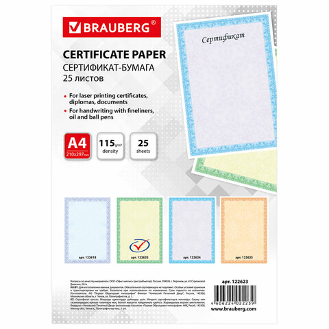 Сертификат-бумага для лазерной печати BRAUBERG, А4, 25 листов, 115 г/м2, "Голубая сеточка", 122618