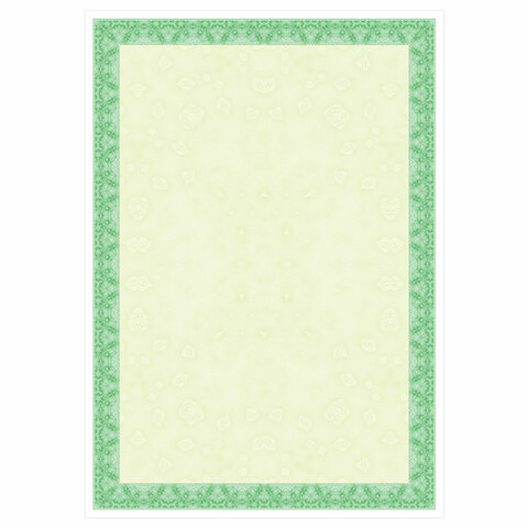 Бумага формата А4 (210х297 мм) выполнена из импортной мелованной бумаги плотностью 115 г/м2. Имеет вертикальную ориентацию. Микропечать защитит документ от копирования. Лицевая сторона украшена рамкой зеленого цвета. Поставляется по 25 листов в термоусадочной пленке.