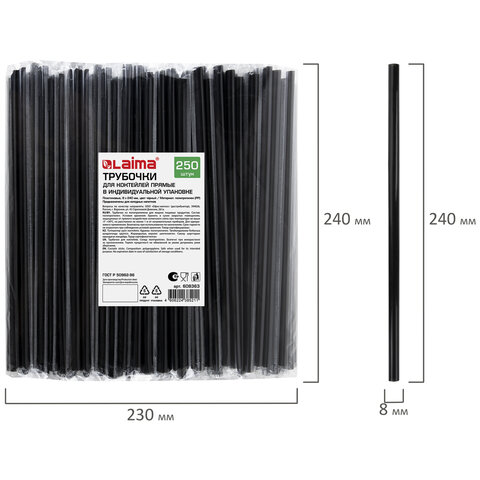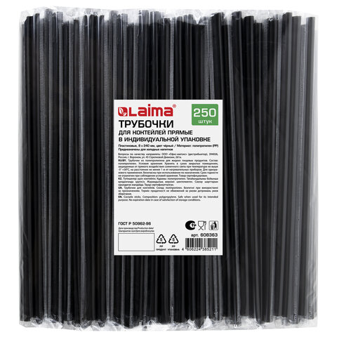 Трубочки для коктейлей прямые в индивидуальной упаковке, 5 х 210 мм, черные КОМПЛЕКТ 700 штук, LAIMA, 608362