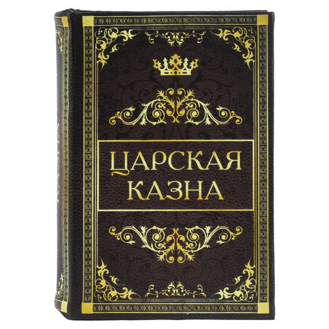 Ящик стилизован под книгу "Царская казна". Обложка выполнена из кожзаменителя тёмно-коричневого цвета. Книга-сейф — это металлический бокс в виде ложной книги. Предназначен для хранения мелких ценных вещей: документы, медикаменты, печати, мелкая наличность. Оригинальный, удобный бокс, который можно использовать как тайничок: бокс маскируется под книжку, незаметен среди других книг на полке. Главная особенность такой вещи в том, что выглядит она весьма оригинально, благодаря чему нравится многим. Фраза "Книга - лучший подарок" еще никогда не была так актуальна.