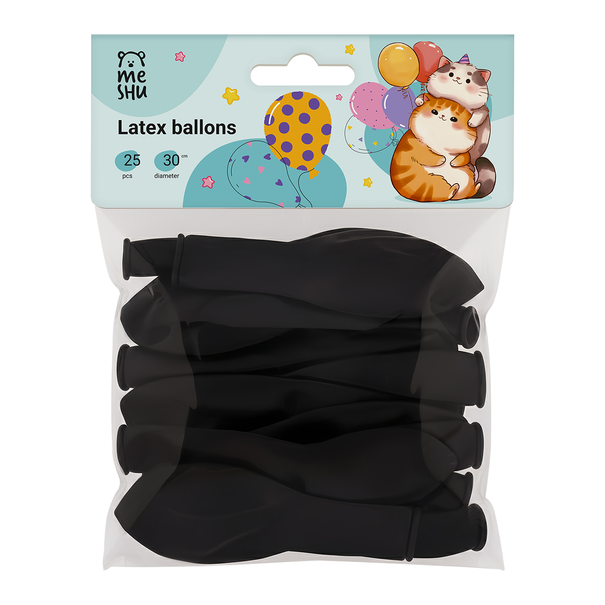 Набор воздушных шаров MESHU поможет оформить помещение для проведения вечеринки, детского праздника. Изделия также подойдут в качестве дополнения к подарку имениннику. В набор входят 25 шариков черного цвета. Размер изделия — 30 см. Шарики сделаны из натурального латекса, поэтому не имеют неприятного химического запаха. Рекомендуем надувать шары размером не более 30 см.<br/>Набор упакован в яркий индивидуальный пакет с европодвесом.<br/>• Материал: латекс;<br/>• Размер: 30 см;<br/>• Цвет: черный;<br/>• Эффект: пастель;<br/>• Индивидуальная упаковка: пакет с европодвесом.