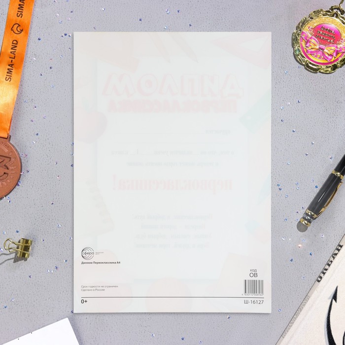 Свидетельство "Первокласснику!" канцелярия, бумага, А4