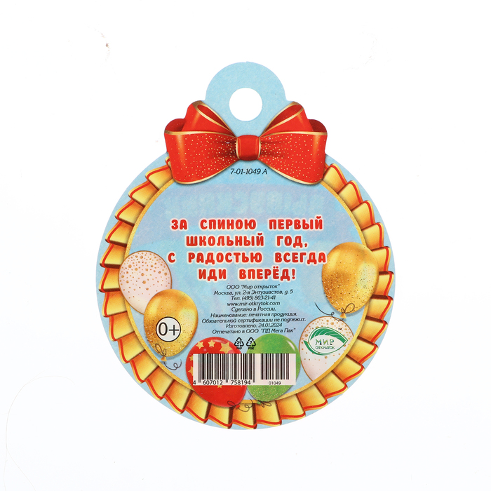 Медаль "Выпускник первого класса!" шары, 10 х 10 см