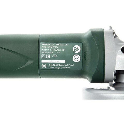 Угловая шлифмашина (болгарка) Bosch PWS 650-125 — электрический инструмент бытового назначения. С его помощью можно выполнять резку металла и других твердых материалов, а также осуществлять шлифовальные, зачистные и обдирочные работы. Модель оснащена щеточным электродвигателем мощностью 650 Вт, который рассчитан на питание от бытовой сети с напряжением 220 В. Максимальная скорость вращения шпинделя составляет 11000 об./мин. Диаметр сменных дисков — до 125 мм.