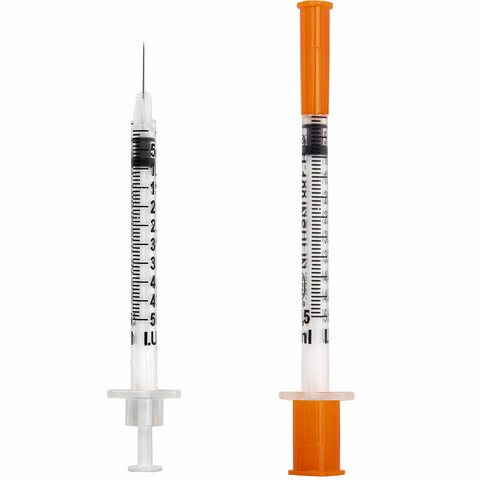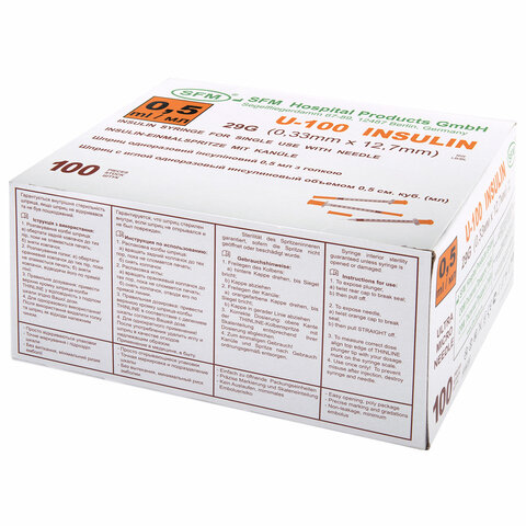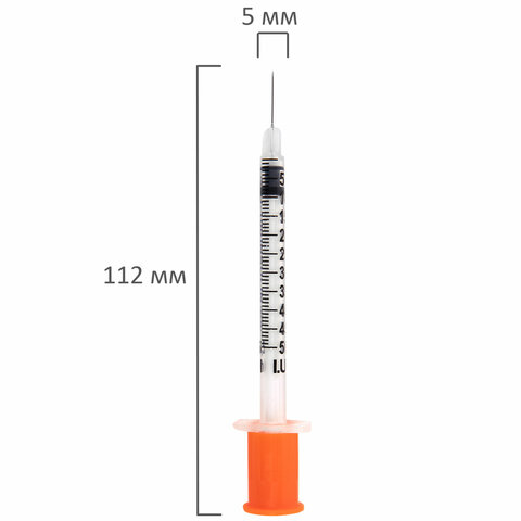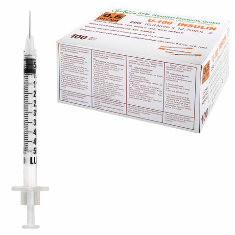Шприц инсулиновый с интегрированной иглой состоит из трех компонентов: цилиндр, поршень и манжета. Имеет градуировку по шкале U-100, объем - 0,5 мл, размер иглы - 29G.