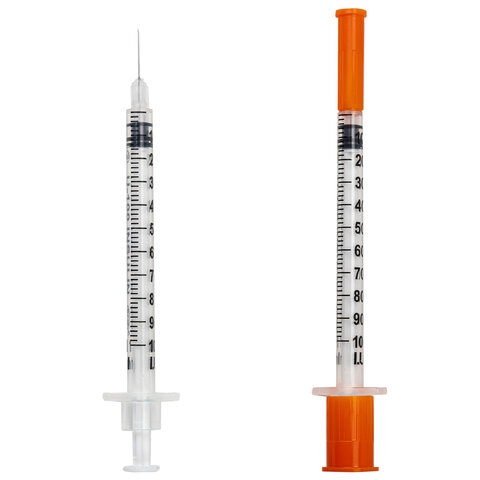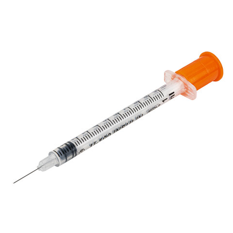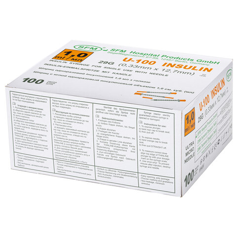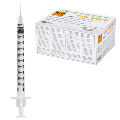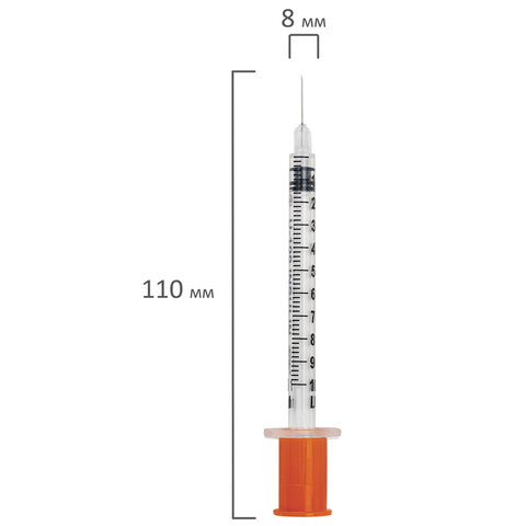 Шприц инсулиновый с интегрированной иглой состоит из трех компонентов: цилиндр, поршень и манжета. Имеет градуировку по шкале U-100, объем - 1 мл, размер иглы - 29G.