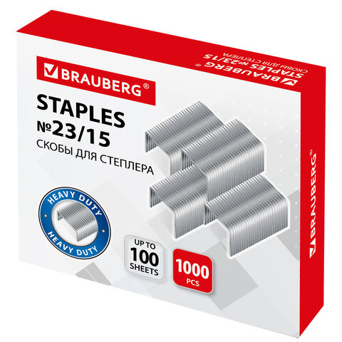 Заточенные стальные скобы серебристого цвета для степлера BRAUBERG размером № 23/15.