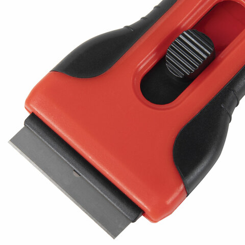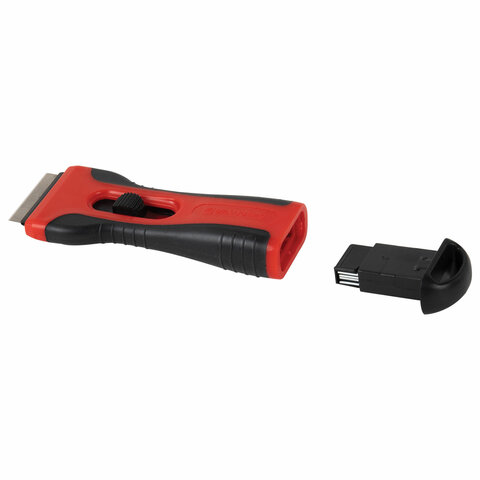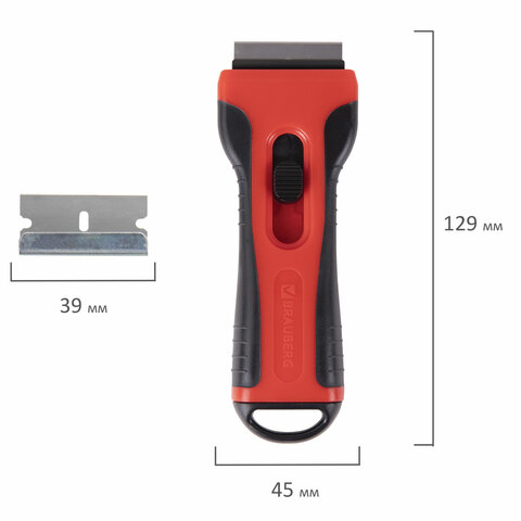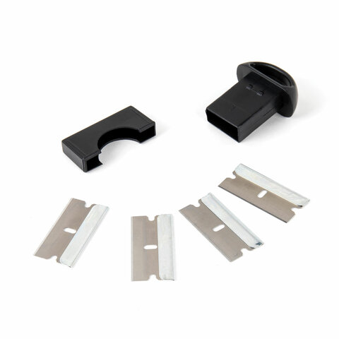 Скребок выполнен из прочного АBS пластика. Прорезиненный корпус препятствует скольжению в руках и обеспечивает удобство в работе. 5 лезвий в комплекте! 1 расположено в держателе, 4 - в специальном отделении корпуса изделия. Ширина лезвия - 39 мм, длина лезвия - 20 мм. Это идеальный помощник для бережного и эффективного удаления с плоских и гладких поверхностей (стекло, плитка, керамические плиты, ламинат и ламинированные поверхности) свежих или застарелых загрязнений от жира, смолы, жевательной резинки, битума или краски.