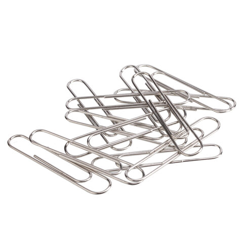 Большие скрепки изготовлены из стали, имеют классическую овальную форму и блестящее никелевое покрытие. Длина скрепки составляет 50 мм. Не окисляются и не повреждают документы. 50 штук в картонной коробке.