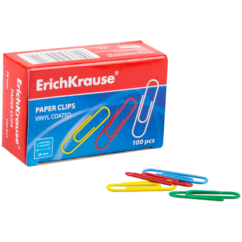 Скрепки 28мм, Erich Krause, 100шт., цветные, карт. упак.