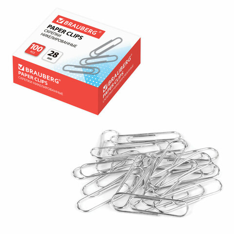 Скрепки изготовлены из стали, имеют классическую овальную форму и блестящее никелевое покрытие. Длина скрепки составляет 28 мм. Не окисляются и не повреждают документы. 100 штук в картонной коробке.