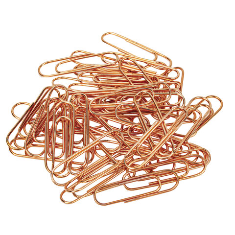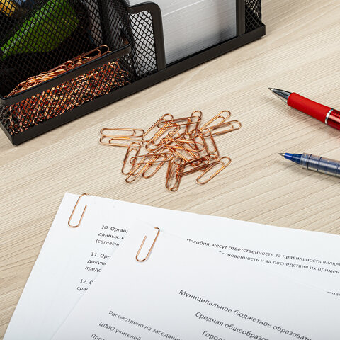 Скрепки изготовлены из стали, имеют классическую овальную форму и медный цвет. Длина скрепки составляет 28 мм. Не окисляются и не повреждают документы. 100 штук в картонной коробке.