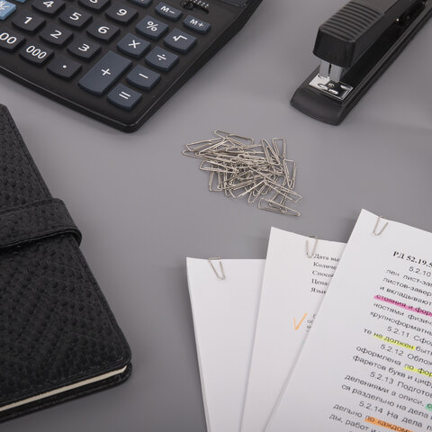 Скрепки изготовлены из стали, имеют классическую овальную форму и блестящее никелевое покрытие. Длина скрепки составляет 25 мм. Не окисляются и не повреждают документы. 100 штук в картонной коробке.