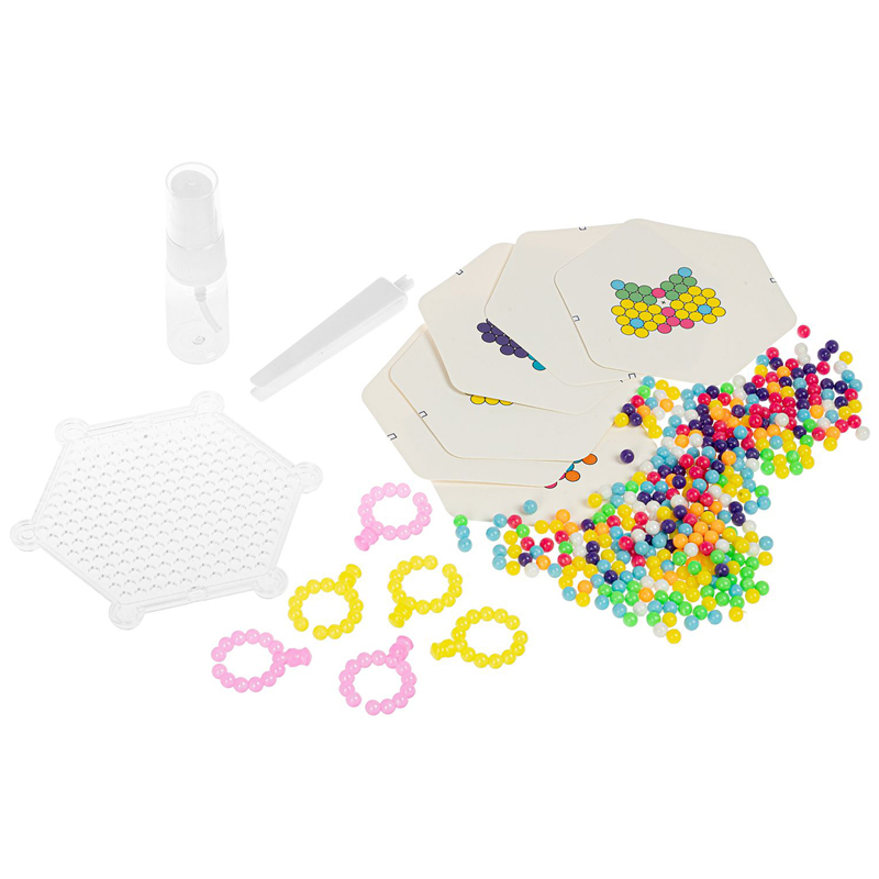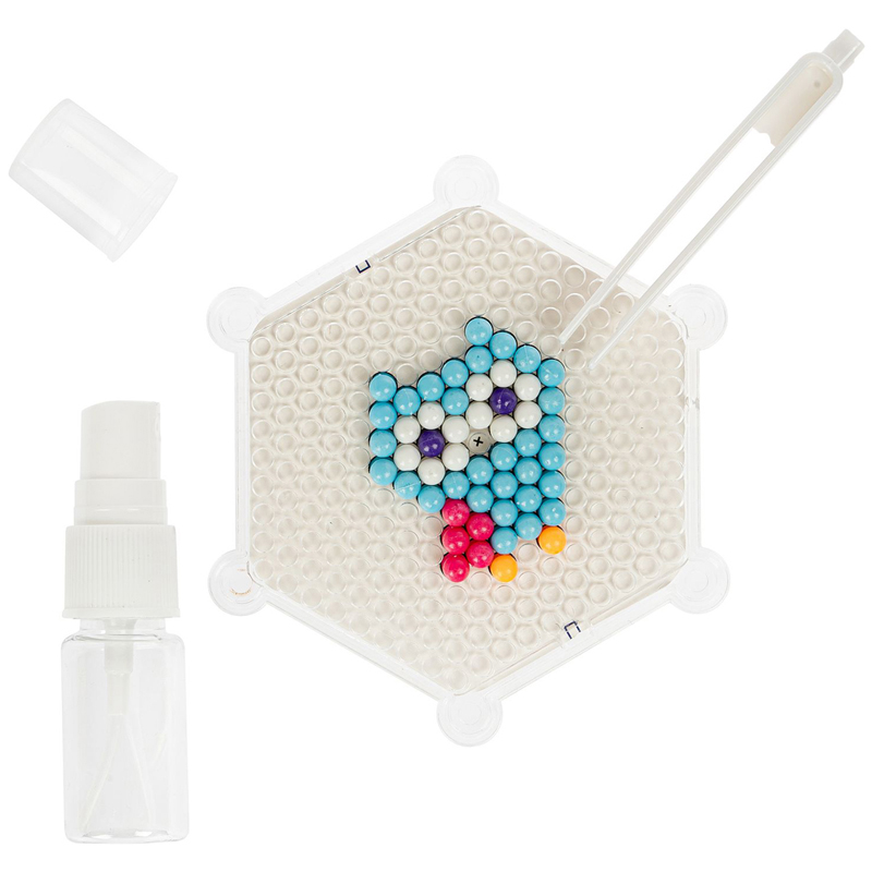 Состав набора: 350 цветных бусин, пластиковая основа для сборки, распылитель воды, карточки-трафареты, пинцет, 6 основ для колец.