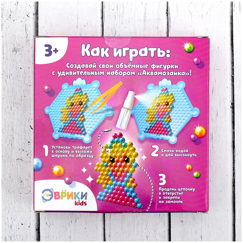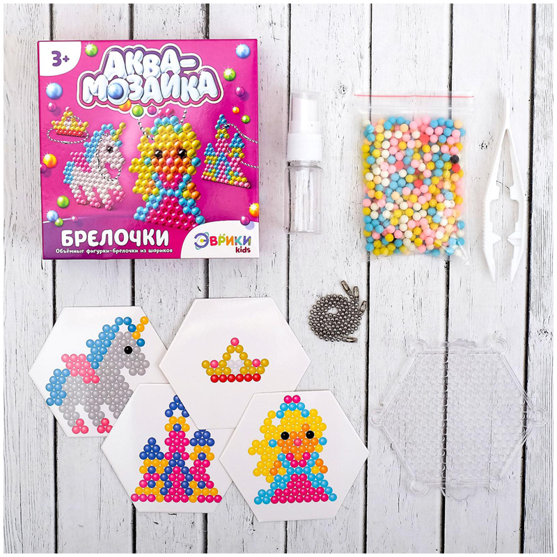 В набор входит: 4 карточки-трафареты пинцет для выкладывания бусин, основание под выкладку, бутылочка с распылителем для воды, комплект шариков-бусин(пластик), цепочки для брелоков -4 штуки