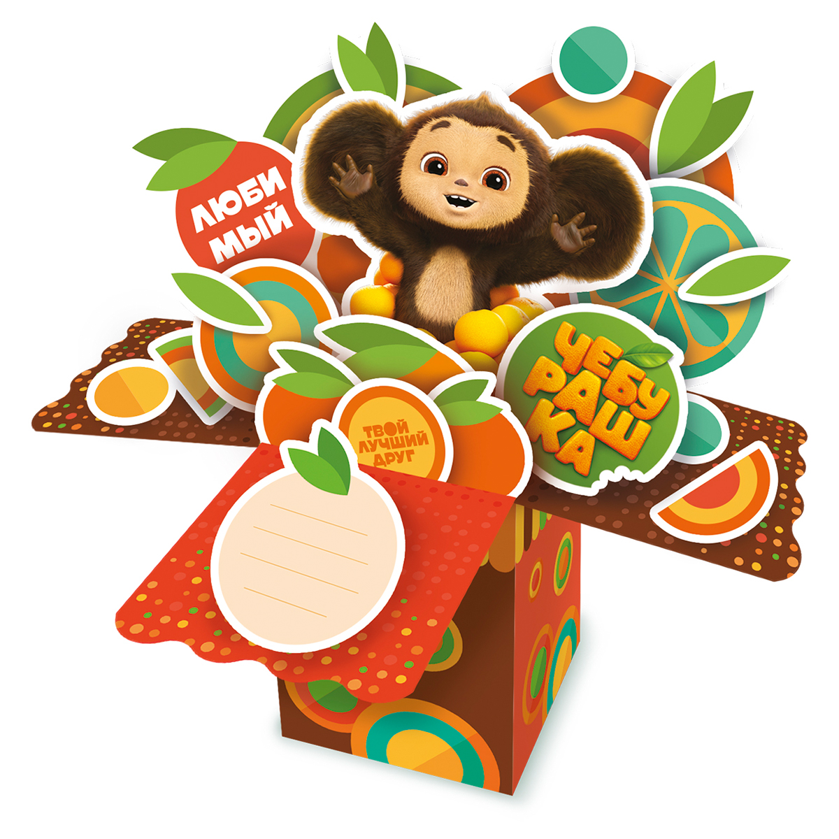 Креативный подарок с любимым героем Чебурашкой – своими руками! Сделайте необычную открытку-коробочку без помощи ножниц. В наборе 20 ярких элементов, клеевые подушечки и простор для фантазии! Сделать 3D-открытку поможет пошаговая инструкция – посмотри, собери и удиви родных и близких оригинальным подарком! Набор для творчества развивает мелкую моторику, воображение и творческое мышление. Рекомендованный возраст: 3+.
