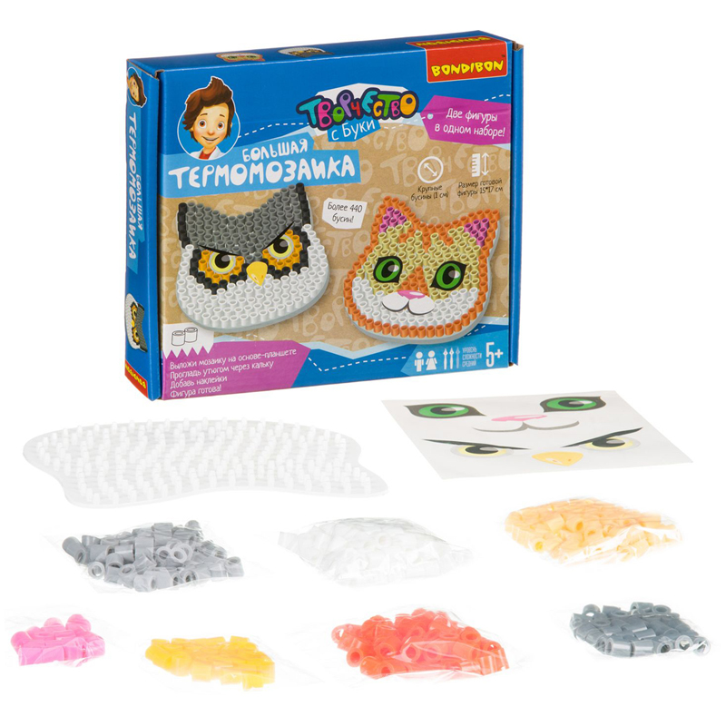 Термомозаика - очень увлекательный и популярный вид детского творчества. В этом наборе от Бондибон более 440 крупных бусин диаметром 1 см. Всё, что нужно для создания необычной игрушки - это собрать бусины на основе-планшете и прогладить через кальку утюгом. Горячая обработка расплавит пластик и склеит детали между собой. После остывания с фигуркой можно играть. Размер готовой фигуры 15х17 см. Из бусинок в наборе можно создать мордочку котика и голову филина, а после украсить выразительными наклейками из набора. В наборе: термобусины, фигурная основа-планшет, инструкция с цветными схемами сборки, калька, наклейки для украшения.