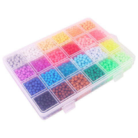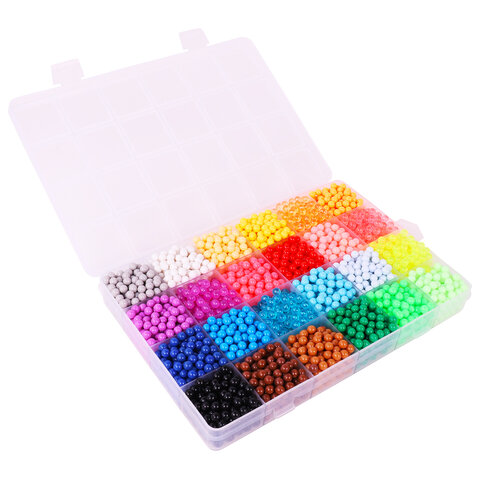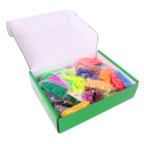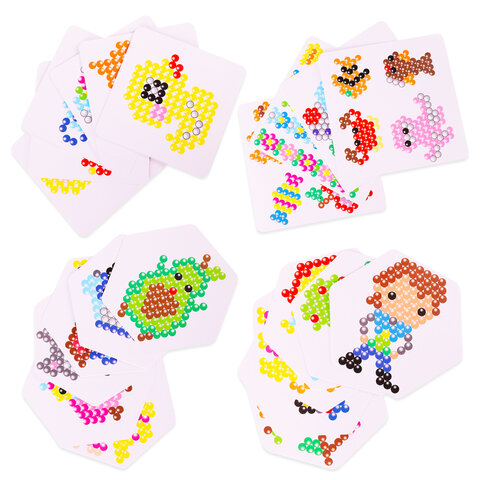 Как играть: 1. Выберите понравившийся рисунок и поместите карточку с ним под прозрачную подставку-трафарет. 2. Набирайте бусины нужных цветов в специальную ручку и выкладывайте их на трафарет, нажав на кнопку внизу ручки. Обратная сторона ручки оснащена специальной ложечкой, которая позволяет набирать по несколько бусин сразу! 3. Продолжайте выкладывать бусины различных цветов по трафарету, пока не закончите рисунок. 4. Наберите в бутылочку обычной воды и побрызгайте на фигурку водой. 5. Подождите 20-60 минут (в зависимости от количества воды, сложности фигурки). 6. Снимите готовую игрушку с подставки специальной лопаткой! Получившаяся игрушка достаточно крепкая, в неё можно играть или подарить друзьям.
