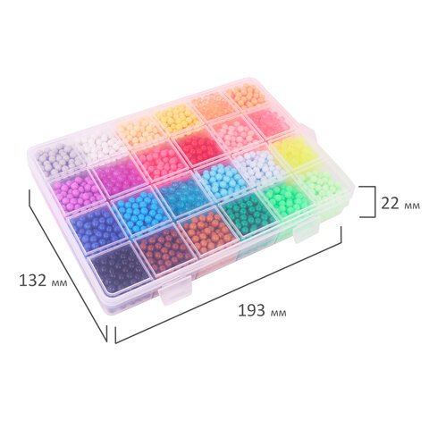 В набор входят бусины 24 различных цветов, около 175 штук каждого цвета, пластиковый контейнер с отсеками для удобного хранения бусин, 3 подставки-трафарета, 16 двусторонних карточек с картинками, бутылочка-пульверизатор для воды, специальная ручка для аквамозаики, лопатка для снятия готовой фигурки с трафарета, а также основы для браслета и других украшений, колечки и крепления для создания брелков, подвесок и других игрушек из бусин. Диаметр одной бусины - 0,5 см.