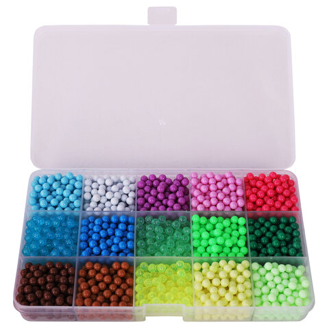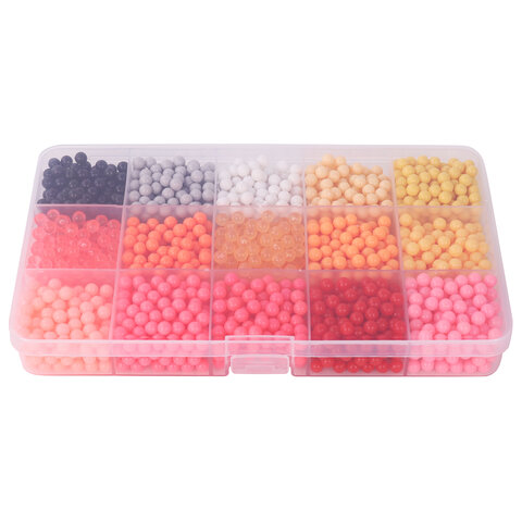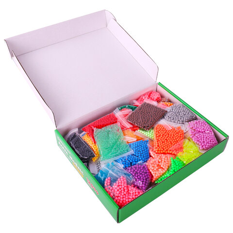 Как играть: 1. Выберите понравившийся рисунок и поместите карточку с ним под прозрачную подставку-трафарет. 2. Набирайте бусины нужных цветов в специальную ручку и выкладывайте их на трафарет, нажав на кнопку внизу ручки. Обратная сторона ручки оснащена специальной ложечкой, которая позволяет набирать по несколько бусин сразу! 3. Продолжайте выкладывать бусины различных цветов по трафарету, пока не закончите рисунок. 4. Наберите в бутылочку обычной воды и побрызгайте на фигурку водой. 5. Подождите 20-60 минут (в зависимости от количества воды, сложности фигурки). 6. Снимите готовую игрушку с подставки специальной лопаткой! Получившаяся игрушка достаточно крепкая, в неё можно играть или подарить друзьям.